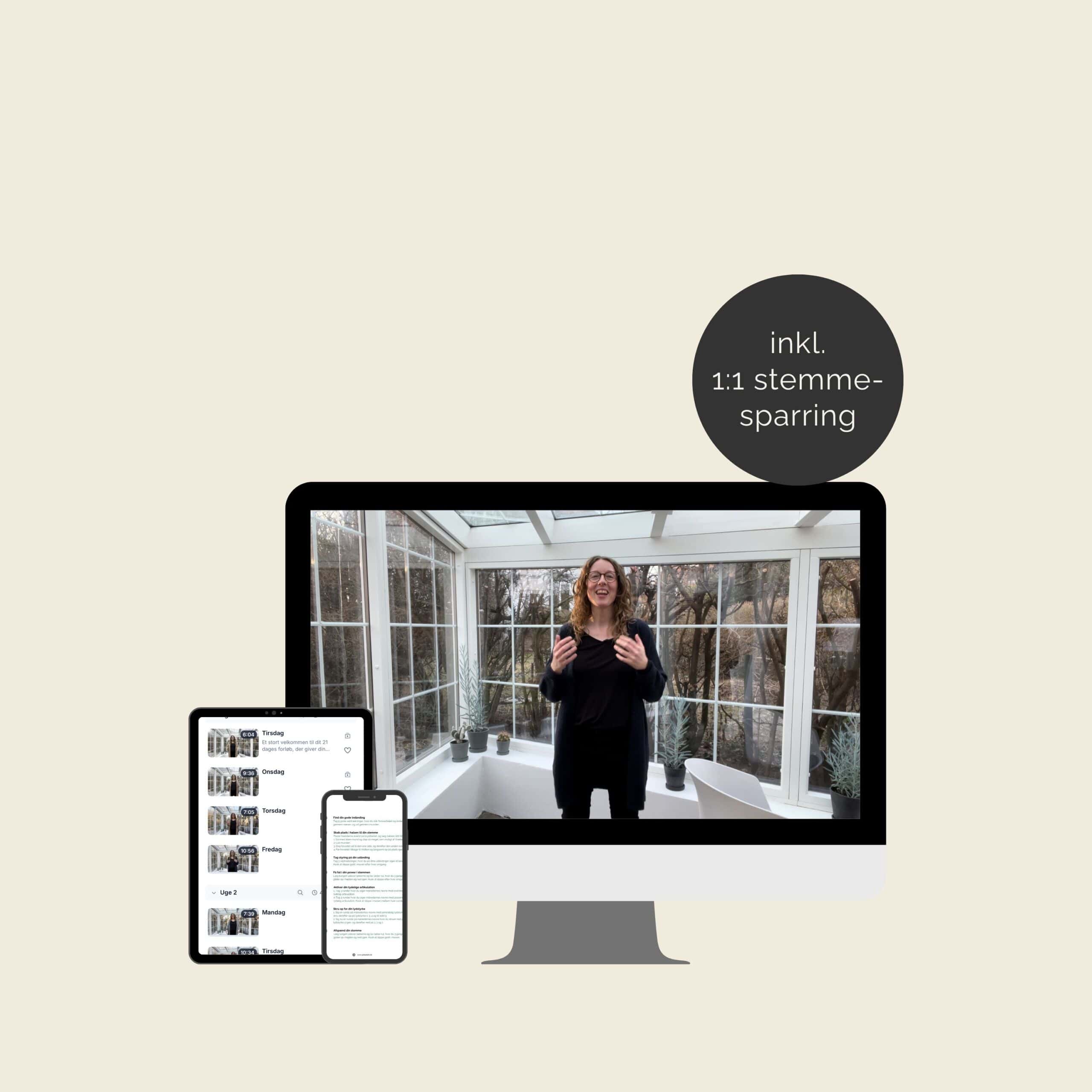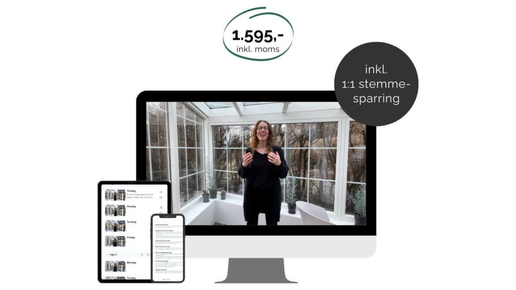 Undervejs får du mulighed for en 20 minutters personlig 1:1-session med mig, hvor du kan få personlig feedback på din træning og din stemme.